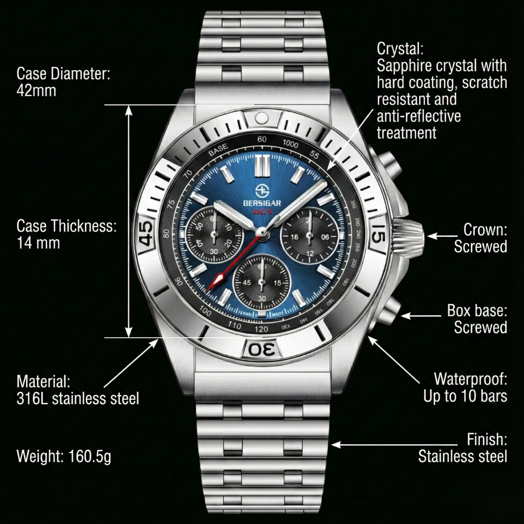 Water resistant to 100 m (330 ft), In general, suitable for professional marine activity and serious surface water sports, but not scuba diving, The crown would need to be pushed in and then screwed down in order to protect the watch from water damage