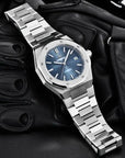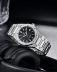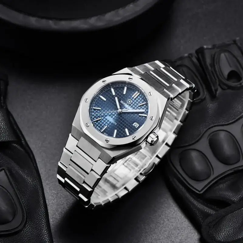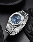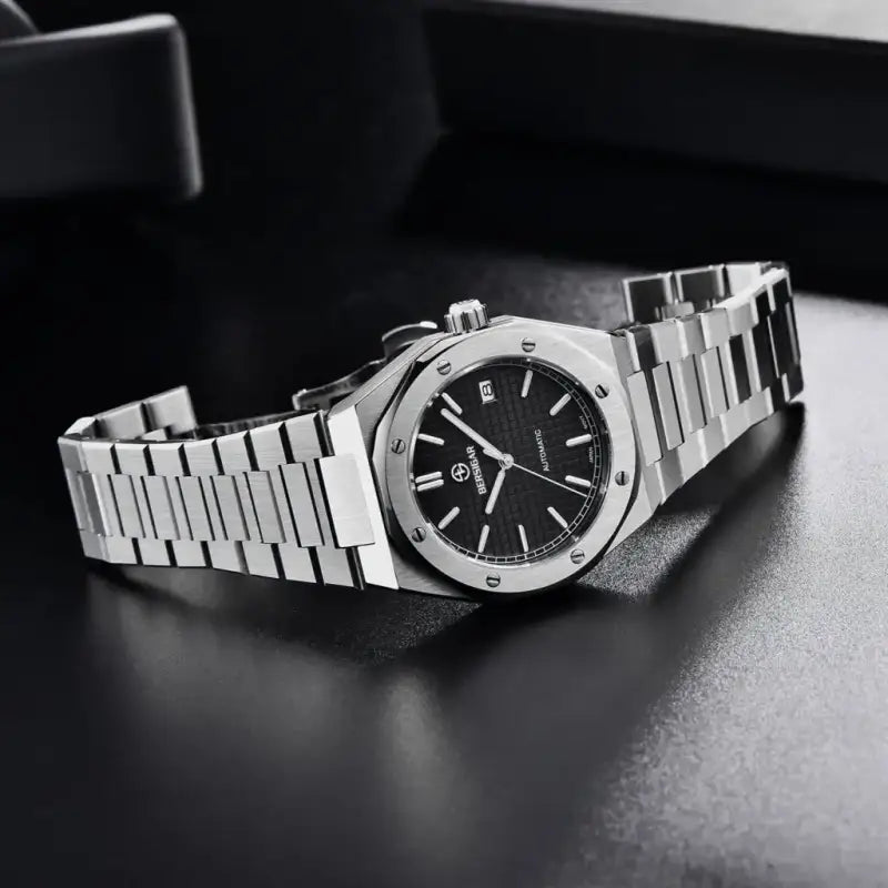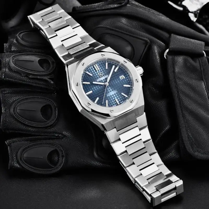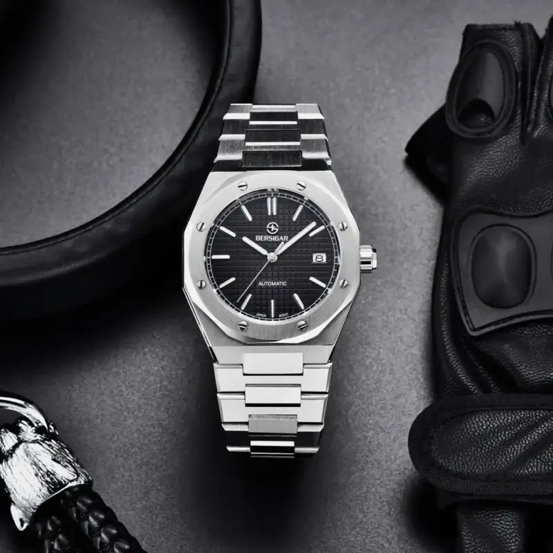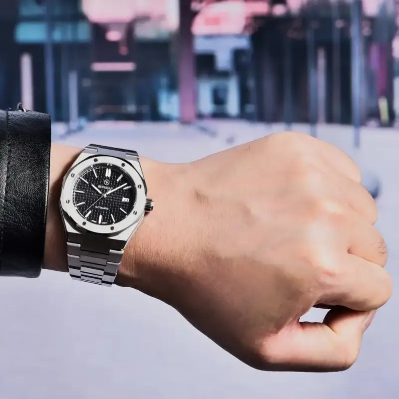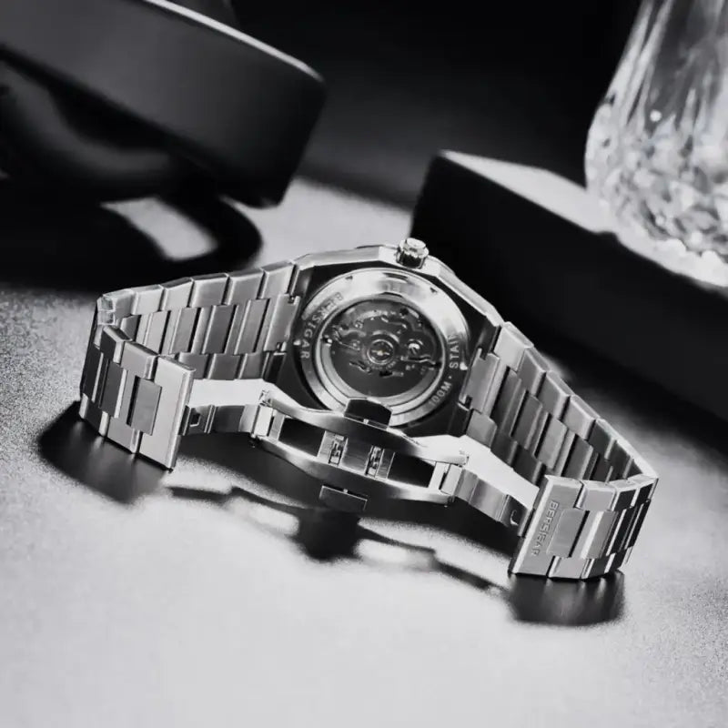 Matériaux premium et design décontracté, verre de cadran en saphir, construction entièrement en acier inoxydable 316L avec couronne vissée, fond de boîtier transparent, bracelet solide et flexible avec fermoir classique à rabat