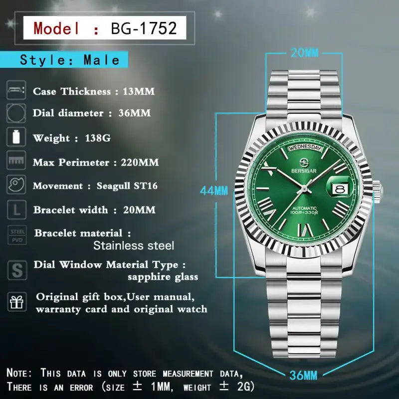 Mouvement mécanique automatique Seagull ST6 de qualité, offrant une grande précision dans l'heure, remontage automatique, et la puissance du ressort peut être réservée pendant plus de 30 heures. Son architecture, sa fabrication et ses caractéristiques innovantes en font un mécanisme exceptionnellement précis et fiable