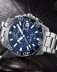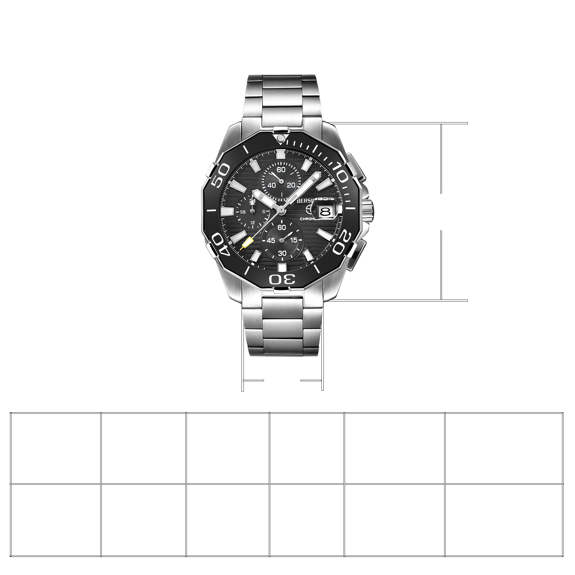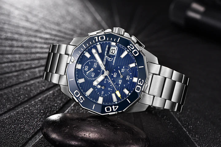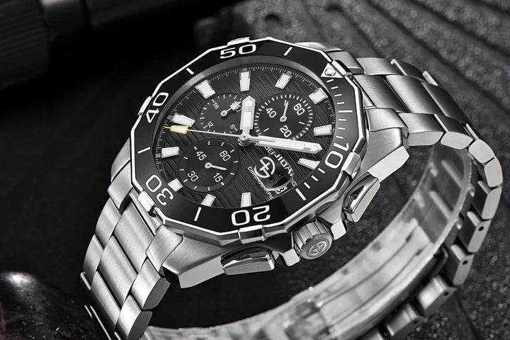 Matériaux premium et design décontracté, verre de cadran en Hardlex, construction entièrement en acier inoxydable 316L avec couronne visséec bezél en céramique peut tourner dans le sens inverse des aiguilles d'une montre, bracelet solide et flexible avec un fermoir classique à rabat