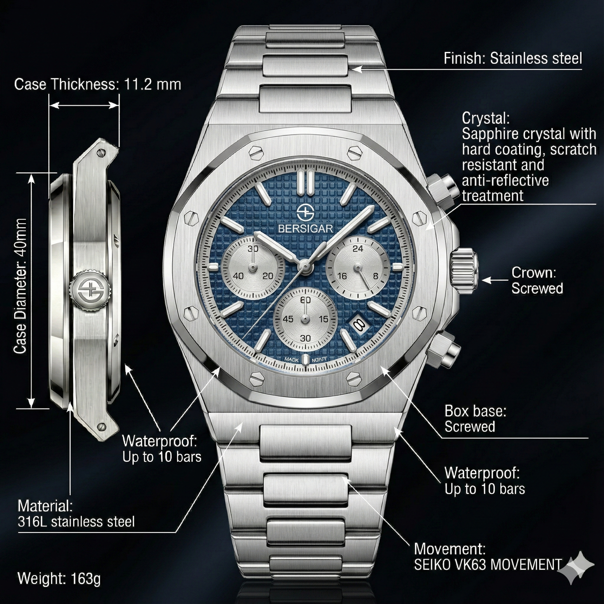 Quality Japanese Seiko VK63 quartz movement, very accurate timekeeping, Its architecture, manufacturing and innovative features make it exceptionally precise and reliable