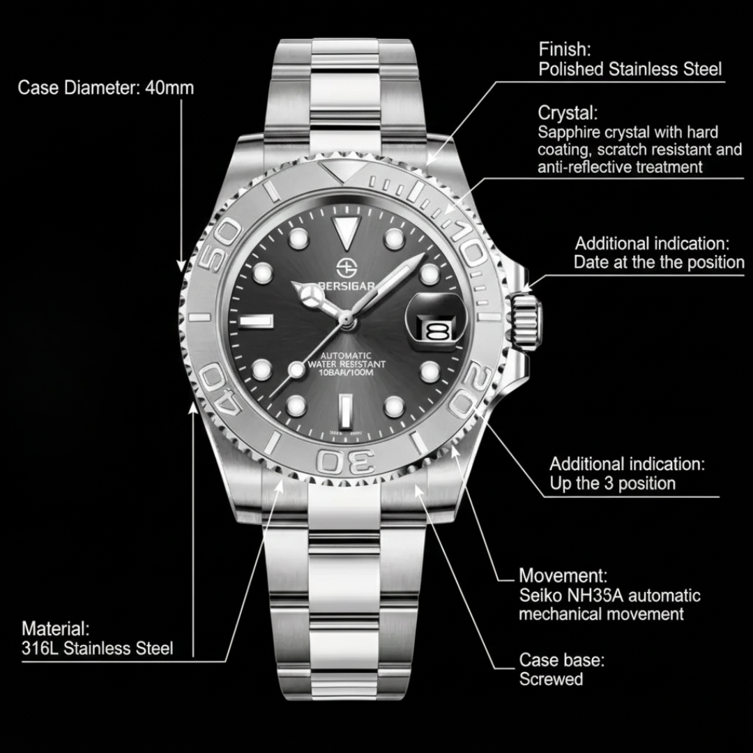 Premium materials and casual design, Crystal Sapphire Glass dial window, full 316L stainless steel construction with screw-down crown, Ceramic Bezel can be rotated counterclockwise and transparent case back, solid and flexible watchband with classic fold-over clasp.