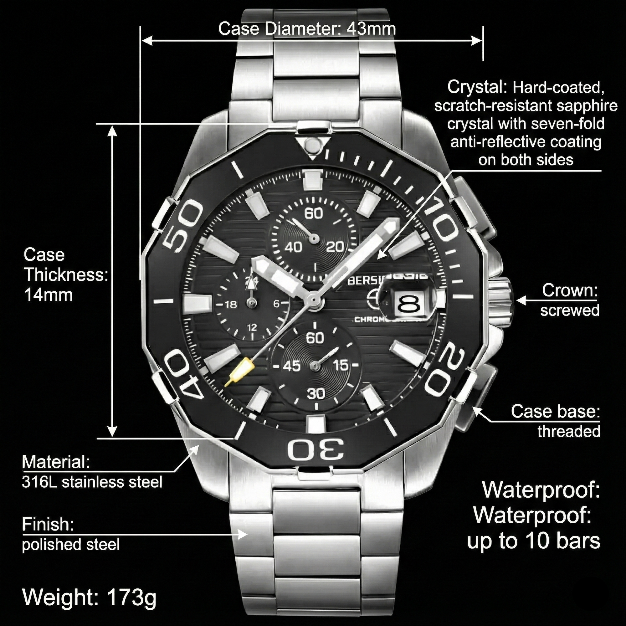 Water resistant to 100 m (330 ft), In general, suitable for professional marine activity and serious surface water sports, but not scuba diving, The crown would need to be pushed in and then screwed down in order to protect the watch from water damage