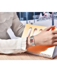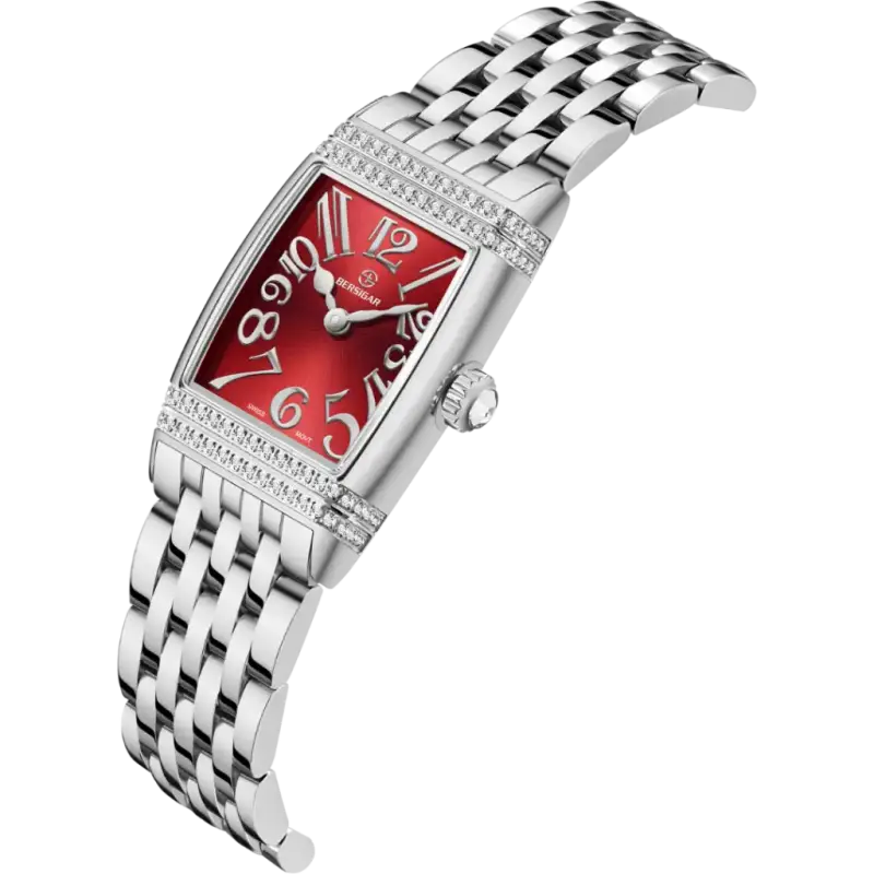Ontdek het elegante ontwerp van de Bersigar 1737 For Women horloge. De vierkante vorm en het rode cijferblad, versierd met glinsterende stenen, stralen verfijning uit. Ideaal voor elke gelegenheid voegt deze horloge de perfecte touch van stijl en glamour toe aan uw outfit. Verhoog uw look met dit must-have horloge.