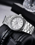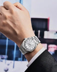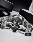 Premium materials and casual design, Sapphire dial window, full 316L stainless steel construction with screw-down crown, transparent case back, solid and flexible watchband with classic fold-over clasp.