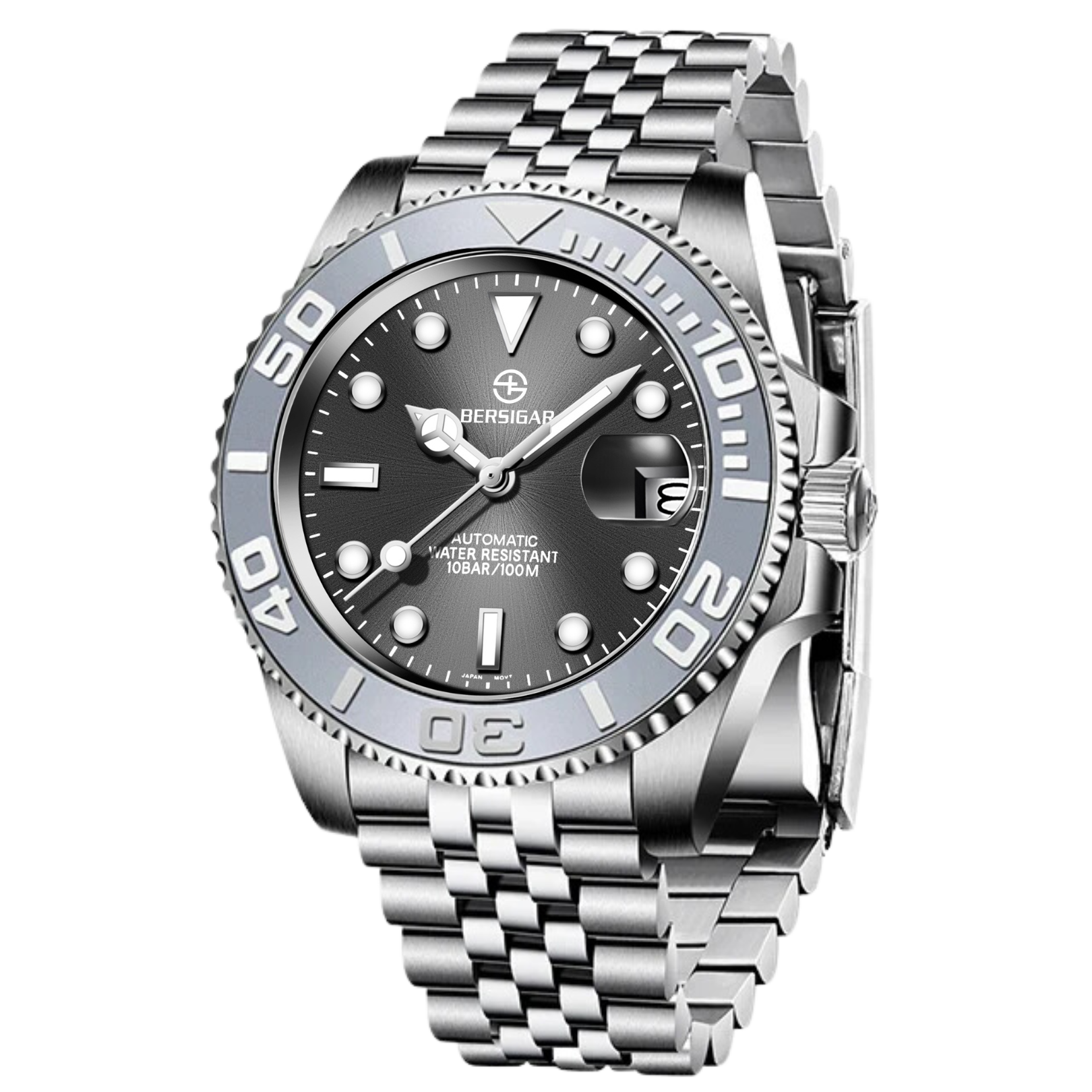 Premium materials and casual design, Crystal Sapphire Glass dial window, full 316L stainless steel construction with screw-down crown, Ceramic Bezel can be rotated counterclockwise and transparent case back, solid and flexible watchband with classic fold-over clasp.