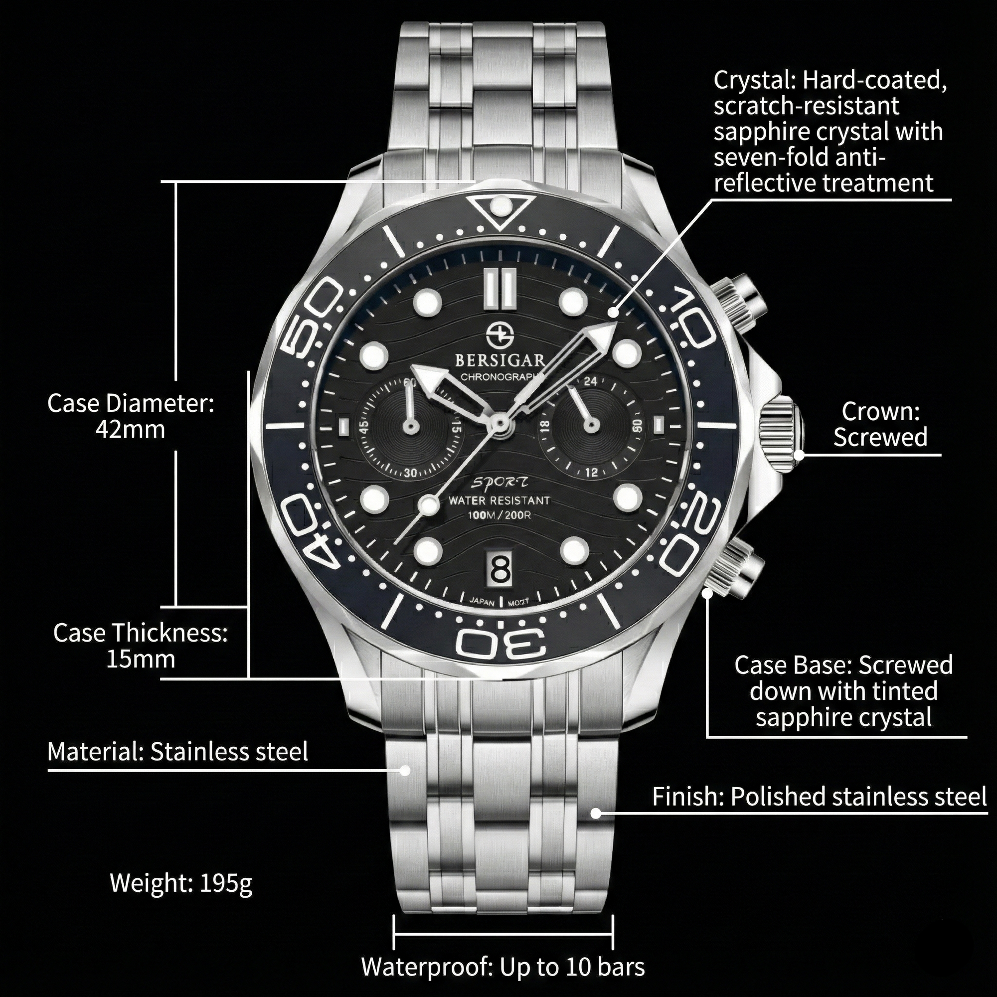 Premium materials and casual design, Sapphire dial window, full stainless steel construction with screw-down crown, ceramic bezel can be rotated counterclockwise and solid case back, solid and flexible watchband with classic fold over clasp.
