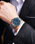 Premium materials and casual design, Sapphire dial window, full stainless steel construction with screw-down crown, ceramic bezel can be rotated counterclockwise and solid case back, solid and flexible watchband with classic fold over clasp.