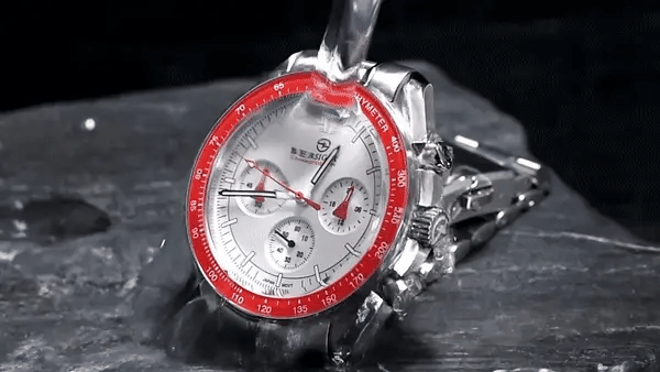 Water resistant to 100 m (330 ft), In general, suitable for professional marine activity and serious surface water sports, but not scuba diving, The crown would need to be pushed in and then screwed down in order to protect the watch from water damage